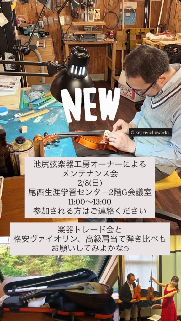 2025年12月17日 / 最終更新日時 : 2025年12月17日 baroque 【 教室だより 】 池尻弦楽器工房オーナーによるメンテナンス会 2/8(日) 尾西生涯学習センター2階G会議室 11:00~13:00 参加される方はご連絡ください。 楽器トレード会と格安ヴァイオリン、高級肩当て引き比べ会も開催されるかも?? ご興味ある方は合わせてお願いいたします。 Follow me!